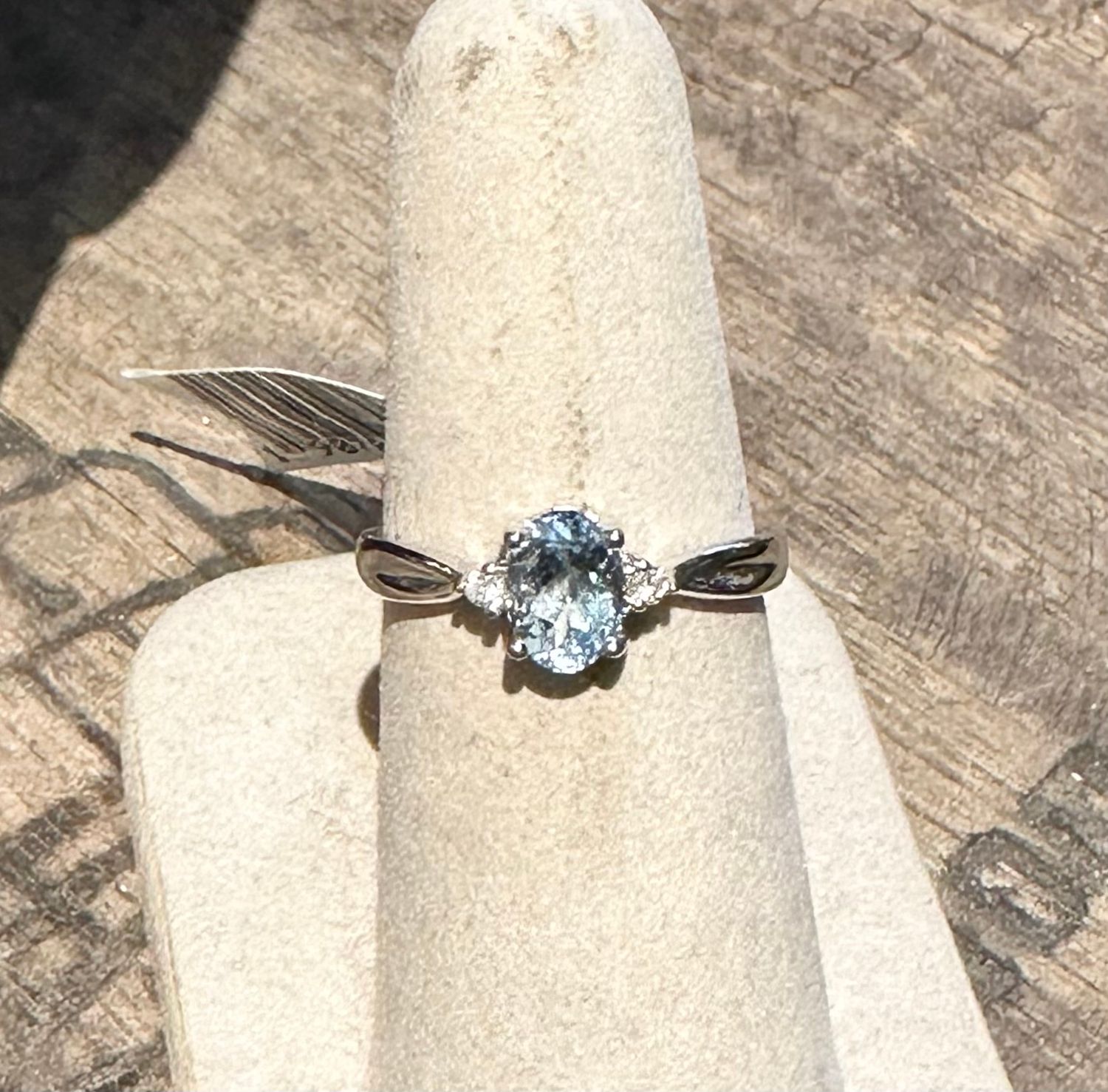 Gorgeous, faceted light blue 0.8 carat oval aquamarine is set in a sterling silver ring with two accent diamonds. Aquamarine is natural. Designed by Lynn Zeng of Standout Design in Los Angeles. Ring is size 7.5 but could be resized.